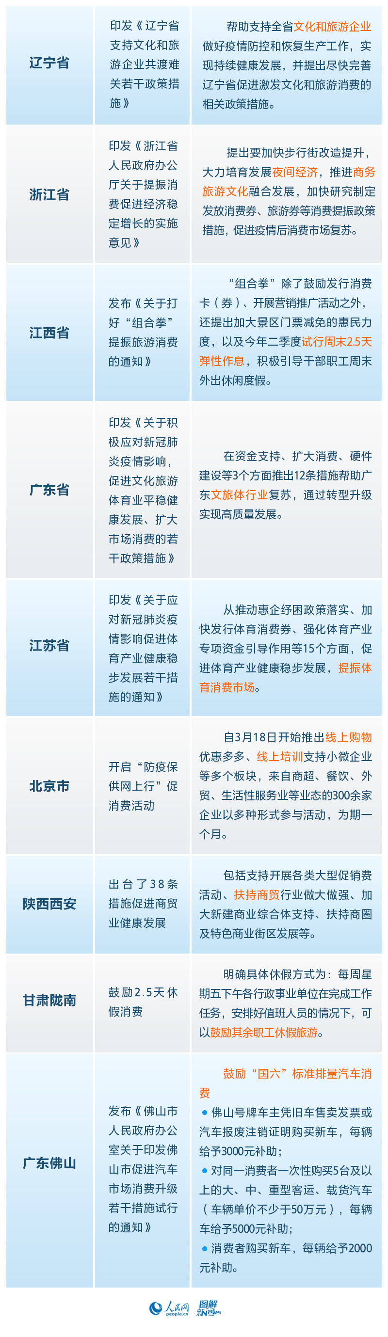 自疫情發生以來,全國多省區市已經在因地制宜、因時制宜地出臺文件和實施辦法來應對疫情帶來的沖擊。2月13日,北京市人力資源和社會保障局新聞發言人介紹了北京市出臺的系列援企穩崗政策;2月17日,江蘇省出臺《關于疫情防控期間穩就業保用工的工作措施》;2月20日,廣東省印發《廣東省進一步穩定和促進就業若干政策措施》;3月13日,合肥市出臺《合肥市疫情防控期間穩就業相關政策實施細則》;3月17日,貴州省印發《促進2020年高校畢業生就業創業十條措施》;3月27日,湖北省政府辦公廳印發《關于應對新冠肺炎疫情影響全力以赴做好穩就業工作的若干措施》……此外,各地也因地制宜,出臺新政提振消費。從推進融合到扶持特色商圈,從鼓勵休假消費到給予購車補貼,多渠道發力,推動經濟復蘇。