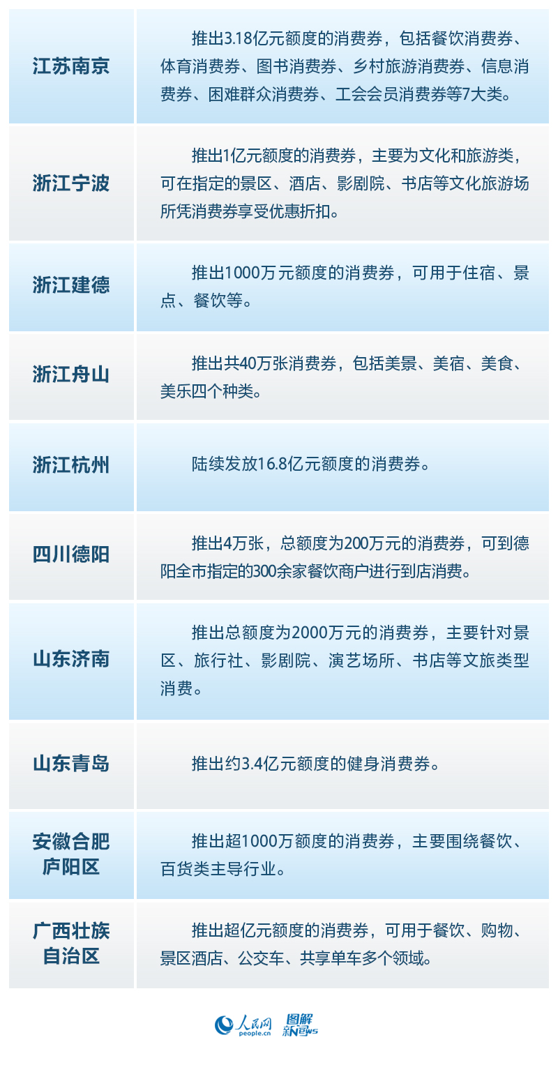 近期,南京、寧波、濟南等地紛紛推出消費券,額度從幾百萬元至上億元不等,涉及餐飲、住宿、健身、文化等多個領域。據了解,南京發放消費券在5天內帶動近千萬元消費,杭州發放第一批消費券即拉動消費4.53億。目前,多省市已推出或計劃推出消費券。