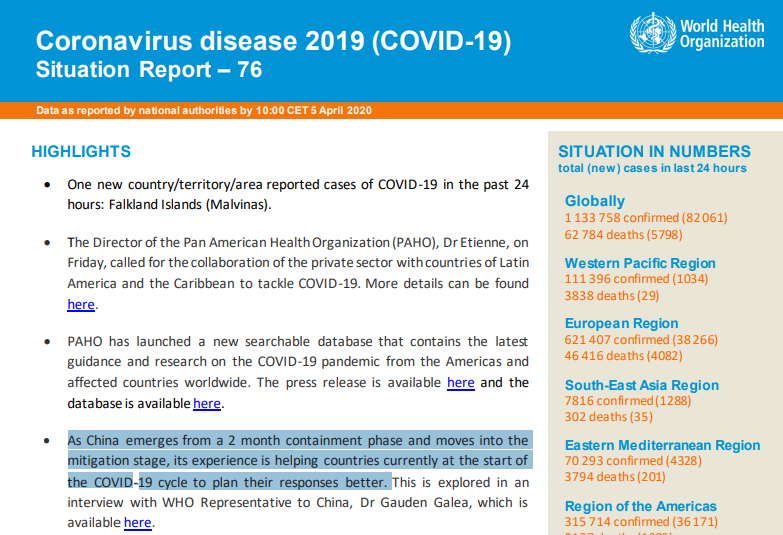 當地時間4月5日,世界衛生組織官網發布第76期新冠肺炎疫情報告。報告中提到,中國在經過兩個月的抗疫奮戰后,已經由“遏制階段”走向“緩疫階段”,中國的經驗正在幫助其他處于抗疫初期的國家,使他們可以更好地制定應對疫情的措施。