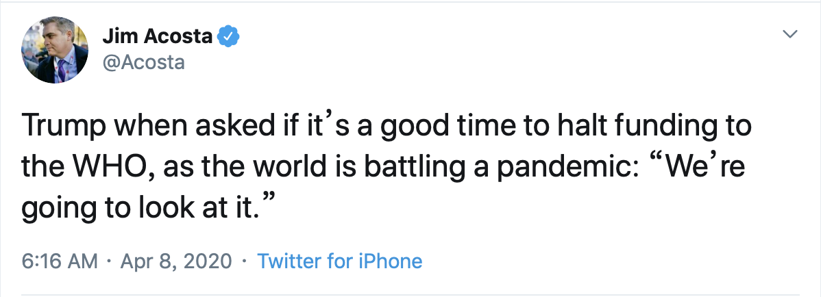 網(wǎng)民:“全球都在抗疫,此時被問及是否是暫停繳納會費(fèi)的好時機(jī)時,特朗普說:‘我們正在考慮。’”↓↓↓