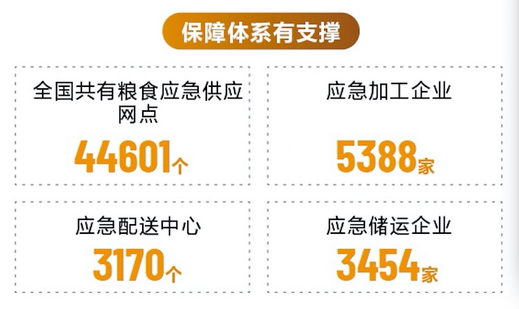 首先,保障體系有支撐,原糧儲(chǔ)備、成品糧儲(chǔ)備充足,一批應(yīng)急加工企業(yè)、應(yīng)急供應(yīng)網(wǎng)點(diǎn)、應(yīng)急配送中心和應(yīng)急儲(chǔ)運(yùn)企業(yè)已建成;其次,市場(chǎng)波動(dòng)有監(jiān)測(cè),我國建立起兩級(jí)監(jiān)測(cè)體系,國家級(jí)糧食市場(chǎng)信息直報(bào)點(diǎn)1072個(gè),地方糧食市場(chǎng)信息監(jiān)測(cè)點(diǎn)9206個(gè);第三,應(yīng)對(duì)變化有預(yù)案:我國建立了從國家、省、市、縣四級(jí)的糧食應(yīng)急預(yù)案體系;第四,保供穩(wěn)市有責(zé)任:我國已建立并督促各地嚴(yán)格落實(shí)糧食安全省長責(zé)任制。