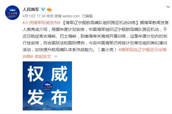 中國臺灣網4月14日北京訊  4月13日,據海軍新聞發言人高秀成介紹,根據年度計劃安排,中國海軍組織遼寧艦航母編隊跨區機動,于近日航經宮古海峽、巴士海峽,到南海有關海域開展訓練,這是年度計劃內的例行性安排,符合國際法和國際慣例,今后中國海軍仍將按計劃常態組織類似演訓活動,加快提升航母編隊體系作戰能力。(完)