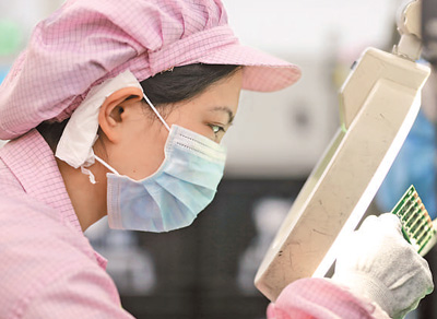 3月31日,在中國信科集團(tuán)烽火通信公司系統(tǒng)設(shè)備制造部的5G智造車間,工人正在生產(chǎn)相關(guān)設(shè)備。