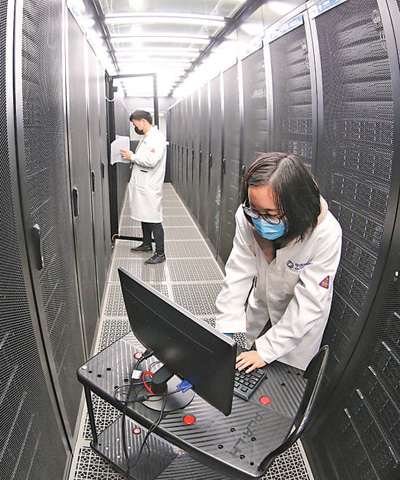 3月24日,中國移動(dòng)(襄陽)數(shù)據(jù)中心,網(wǎng)絡(luò)工程師在新型綠色倉儲(chǔ)式數(shù)據(jù)中心進(jìn)行網(wǎng)絡(luò)調(diào)試。