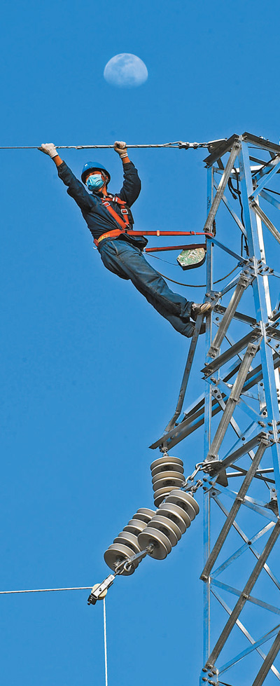 4月4日,在安徽省亳州市譙城區(qū),國網(wǎng)亳州供電公司電力工人正在架設(shè)輸電線路。