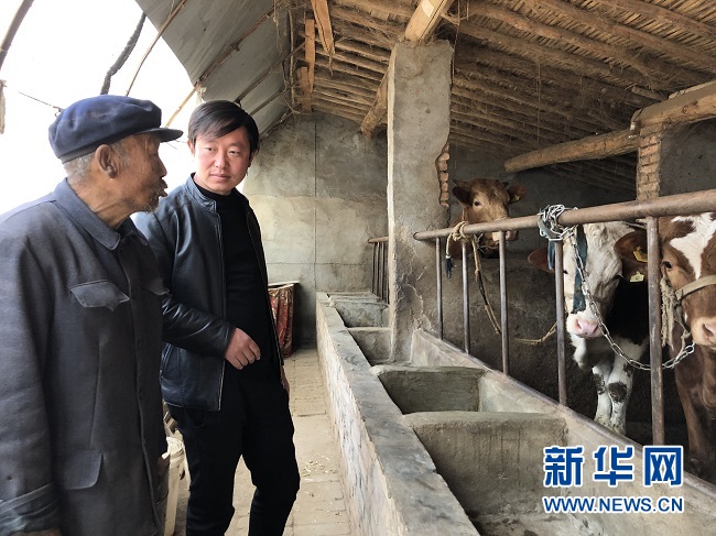 馬金龍(右一)和徐萬余在牛棚中拉家常。新華網發(張文靜 攝)