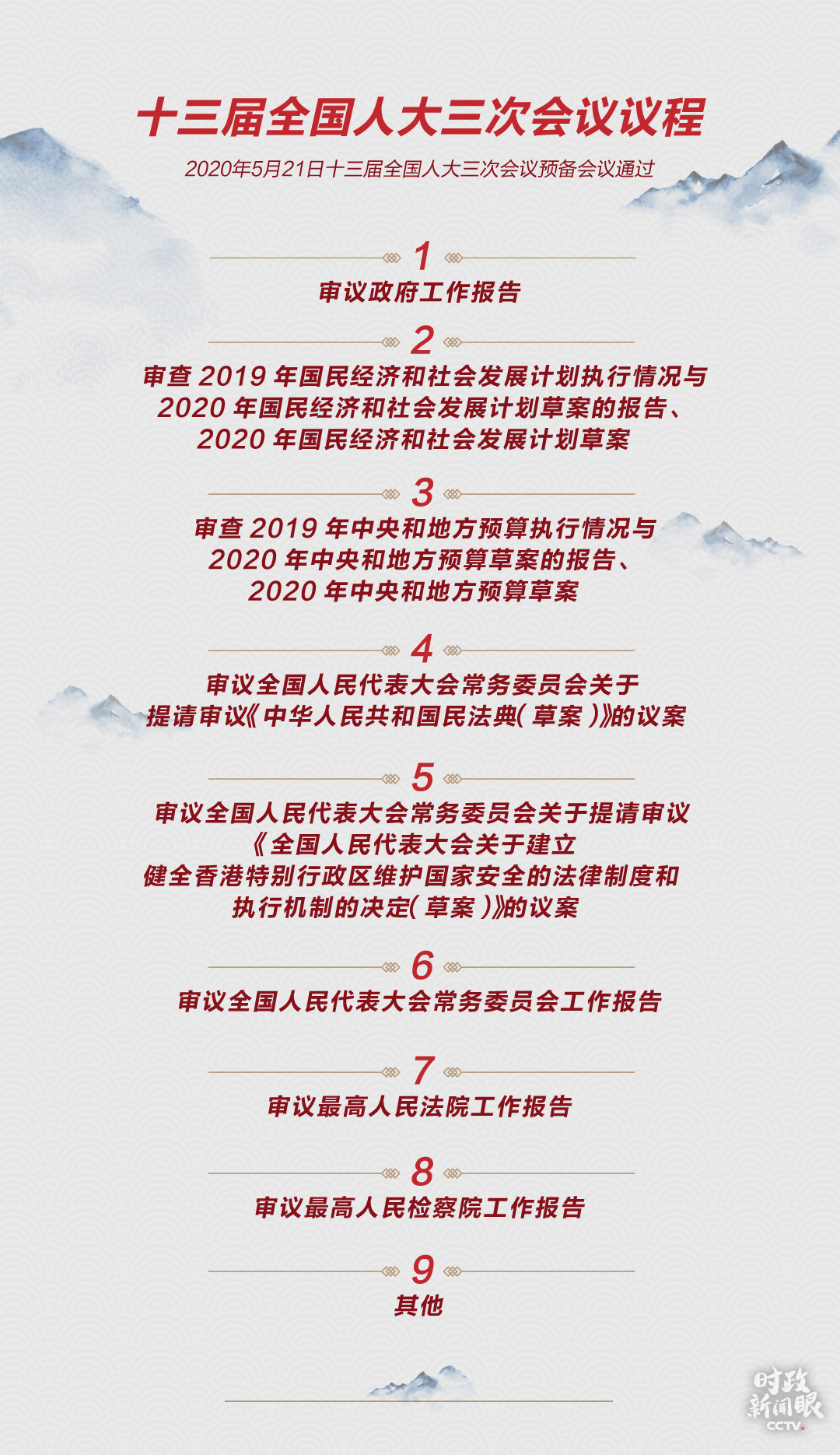 大會主席團第一次會議結束后,十三屆全國人大三次會議發言人張業遂在當晚的新聞發布會上公布,這次大會會期7天,將于5月22日上午開幕,28日下午閉幕,共安排3次全體會議。大會共有9項議程。