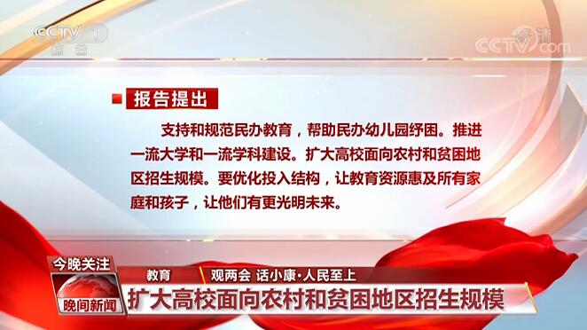 如何提高教育公平與質量?報告提出,支持和規范民辦教育,幫助民辦幼兒園紓困。推進一流大學和一流學科建設。擴大高校面向農村和貧困地區招生規模。要優化投入結構,讓教育資源惠及所有家庭和孩子,讓他們有更光明未來。