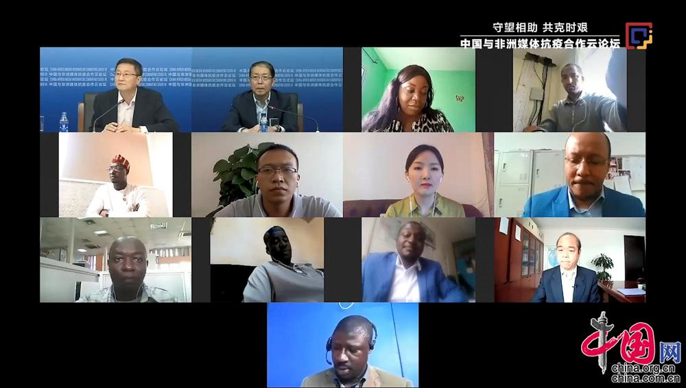 來自中國與非洲9國的12位新聞官員與資深媒體人士相聚云端,圍繞“加強(qiáng)中非國際傳播合作,凝聚全球抗疫媒體正能量”這一主題分享經(jīng)驗(yàn)、匯聚智慧。視頻截圖