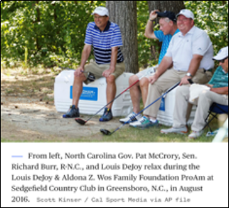 △路易斯·德喬伊(左三)與前北卡羅萊納州州長帕特·麥克羅里等人在北卡的鄉村俱樂部休閑(圖片來源:美聯社)