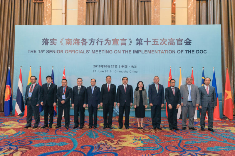 2018年6月25日至27日,中國與東盟國家11國在中國湖南省長沙市舉行落實《南海各方行為宣言》第15次高官會和第24次聯合工作組會。這是與會代表合影。新華社發(張笑宇攝)