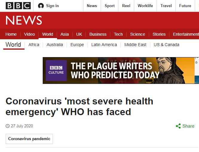 據英國廣播公司(BBC)報道,自1月以來,全球報告新冠確診病例超過1600萬例,死亡病例超過65萬例。譚德塞稱,“我在1月30日宣布國際關注的突發公共衛生事件時……中國以外地區確診病例不到100例,死亡病例(還)沒出現……”