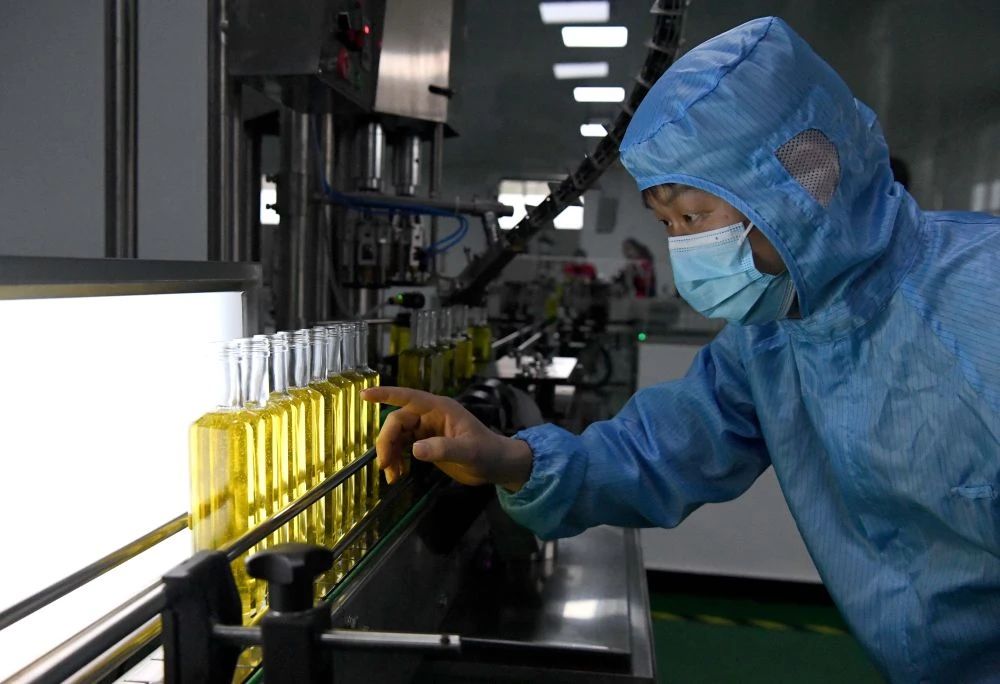 △3月27日,工作人員在河南省光山縣一家油茶加工企業的灌裝車間作業。