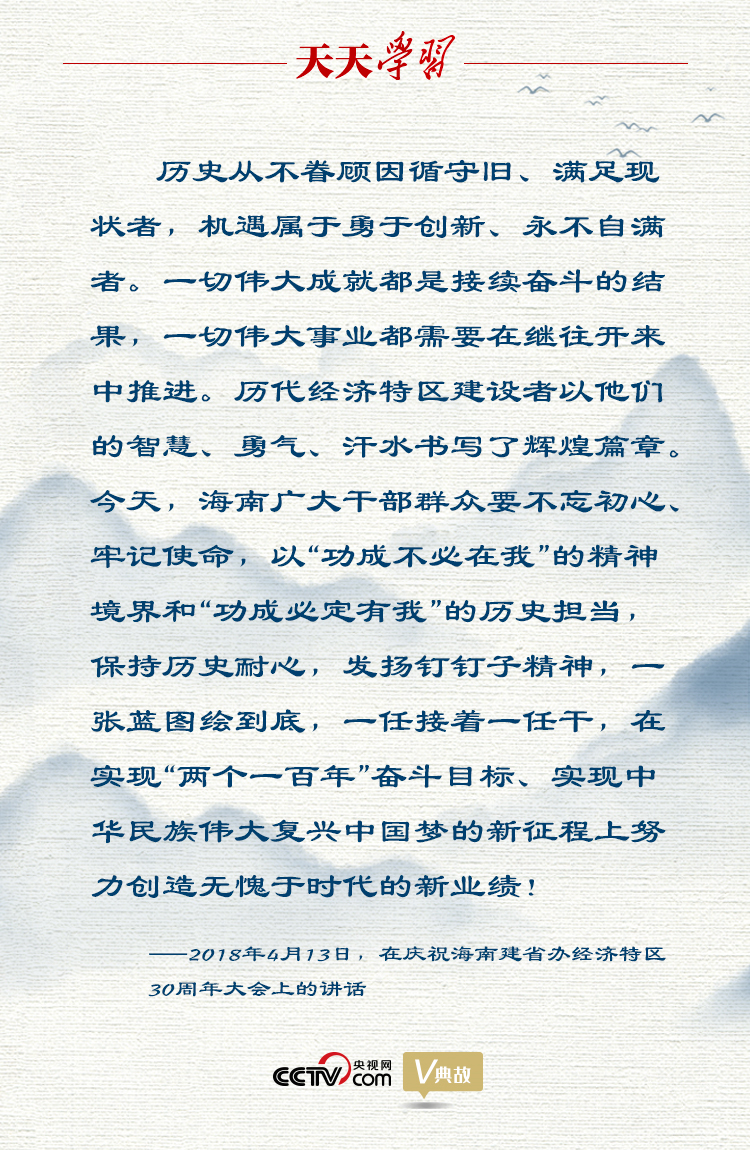 2018年4月13日,在慶祝海南建省辦經(jīng)濟特區(qū)30周年大會上,習近平總書記充分肯定經(jīng)濟特區(qū)建設的歷史功績,深刻總結經(jīng)濟特區(qū)建設的寶貴經(jīng)驗,提出在新時代新起點上繼續(xù)把全面深化改革推向前進,強調(diào)要以“功成不必在我”的精神境界和“功成必定有我”的歷史擔當,保持歷史耐心,發(fā)揚釘釘子精神,一張藍圖繪到底,一任接著一任干,為新時代進一步辦好經(jīng)濟特區(qū)指明了前進方向、提供了根本遵循。