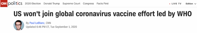 對此,CNN評論稱,特朗普政府在美國確診病例超過600萬的關(guān)鍵時刻作出這一決定,將使美國孤立于參與“新冠肺炎疫苗實施計劃(COVAX)”的170多個國家之外。