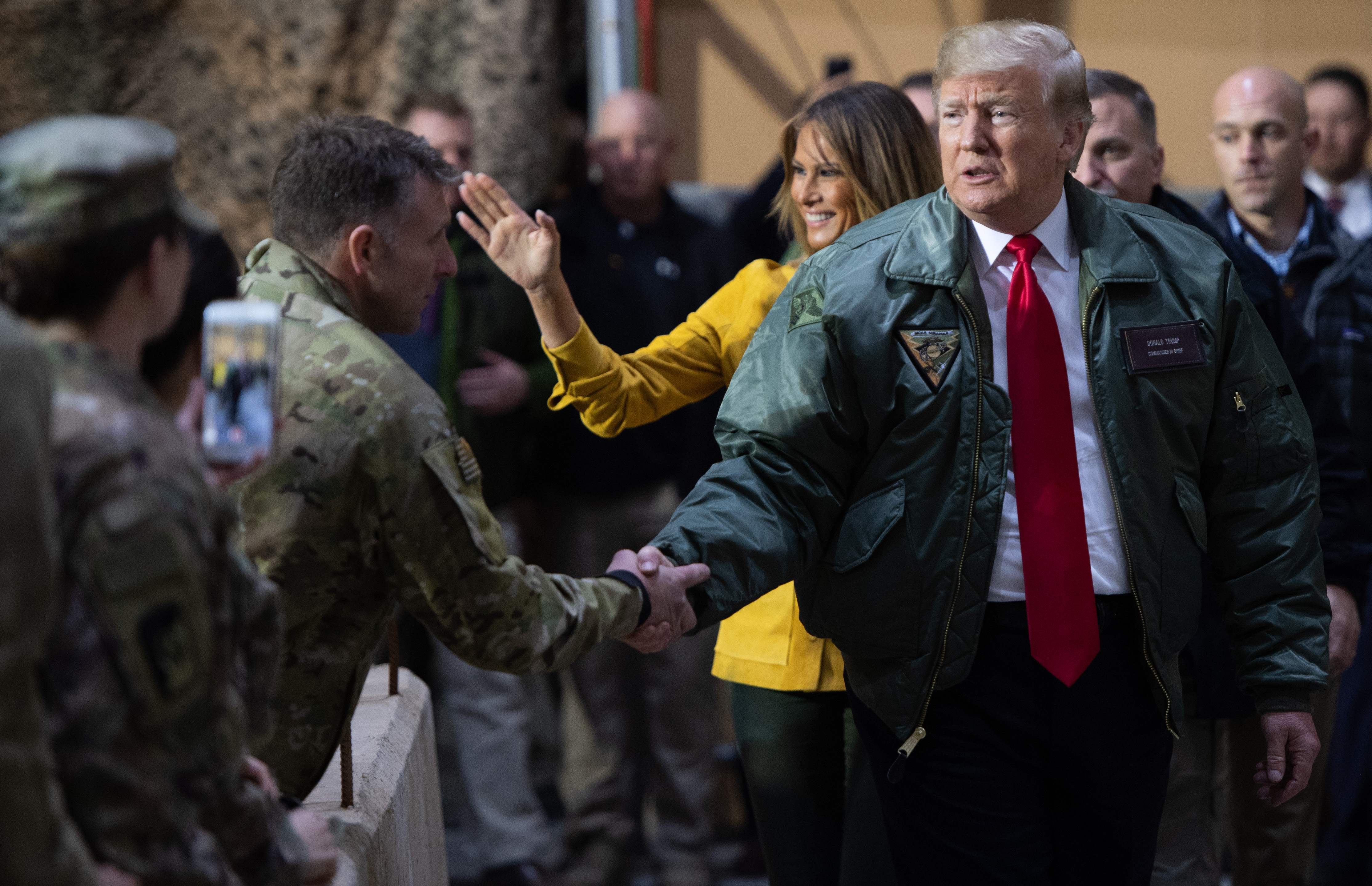 2018年12月26日,在伊拉克西部安巴爾省的阿薩德空軍基地,美國總統(tǒng)特朗普(右)與駐伊美軍官兵握手。(新華社/法新)