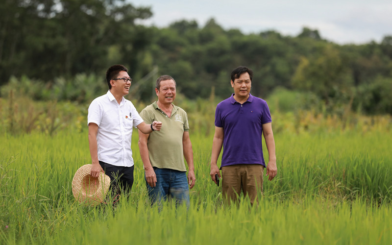 黃海軍(左一)、曹文超(右一)正在田間觀察村里紅米水稻的長(zhǎng)勢(shì)。孟凡盛 攝