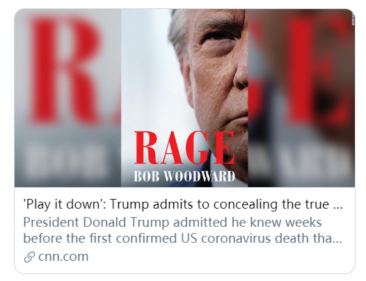 曾揭露“水門事件”的調(diào)查記者伍德沃德的新書《憤怒》9月15日將上市,該書記錄了伍德沃德從2019年12月5日至2020年7月21日先后18次采訪特朗普的內(nèi)容。其中部分采訪錄音和內(nèi)容被提前透露給媒體。