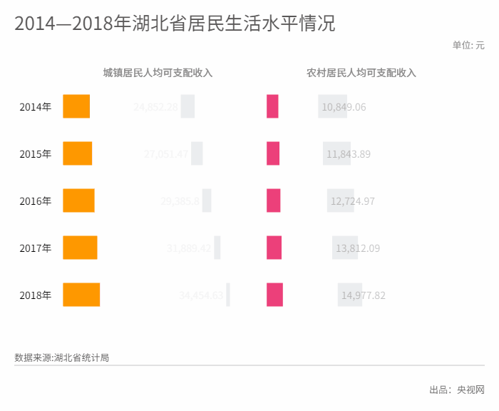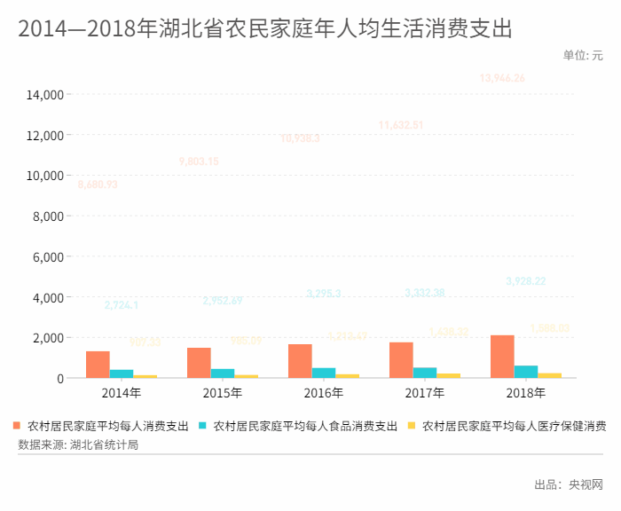 2019年湖北農(nóng)村貧困人口為5.8萬人,比上年減少92.5萬,脫貧任務(wù)成果斐然。農(nóng)村人均可支配收入逐年增長,2018年為人均14977元。農(nóng)村家庭年人均消費支出也增至13946元,比上年增長8.3%。