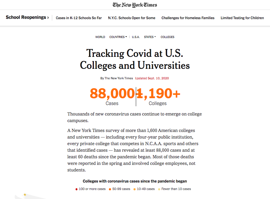 △《紐約時(shí)報(bào)》報(bào)道,美國高等教育院校中已有至少8.8萬例確診病例,超1190所高校受影響。