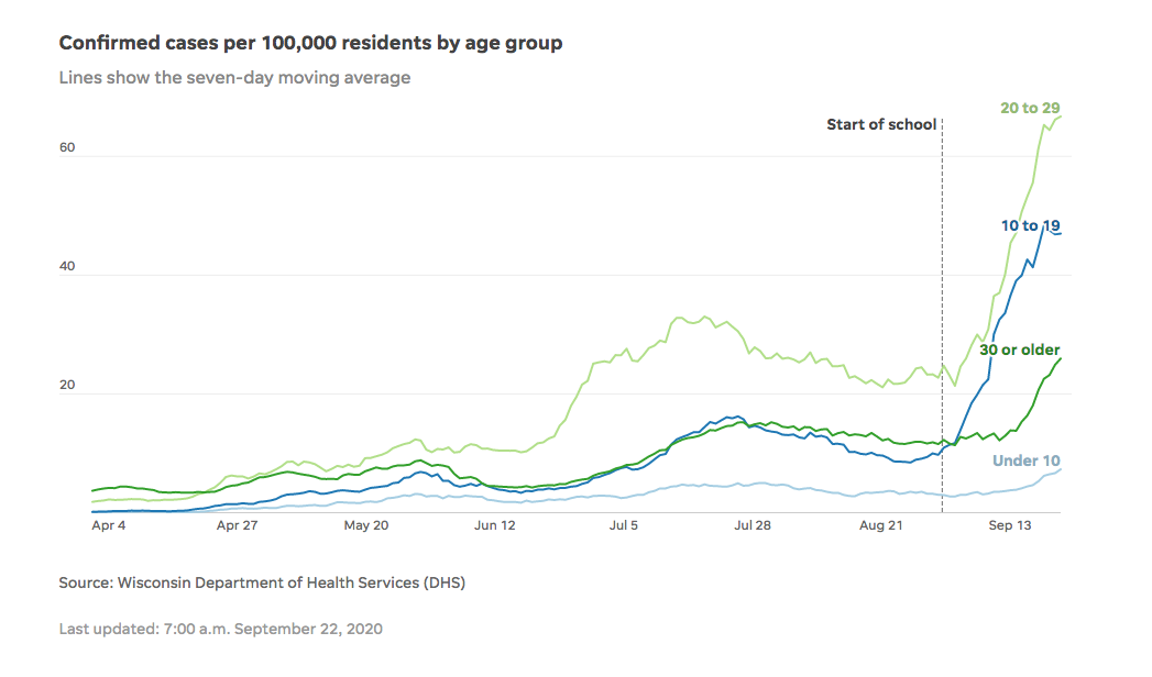 △威斯康星州(Wisconsin)衛(wèi)生服務(wù)部的統(tǒng)計(jì)數(shù)據(jù)顯示,自該州的大學(xué)校園陸續(xù)重啟后,新冠新增感染病例開始直線上升。