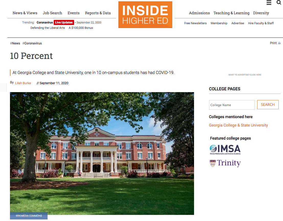 △據(jù)《走進(jìn)高等教育》(Inside Higher ED)報(bào)道,在佐治亞學(xué)院和佐治亞州立大學(xué),每10名在校生中就有1人感染新冠。