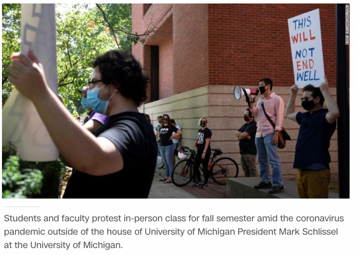 △美國有線電視新聞網(wǎng)報(bào)道,高校明知風(fēng)險(xiǎn)卻堅(jiān)持開學(xué),細(xì)數(shù)它們的種種錯(cuò)誤政策。