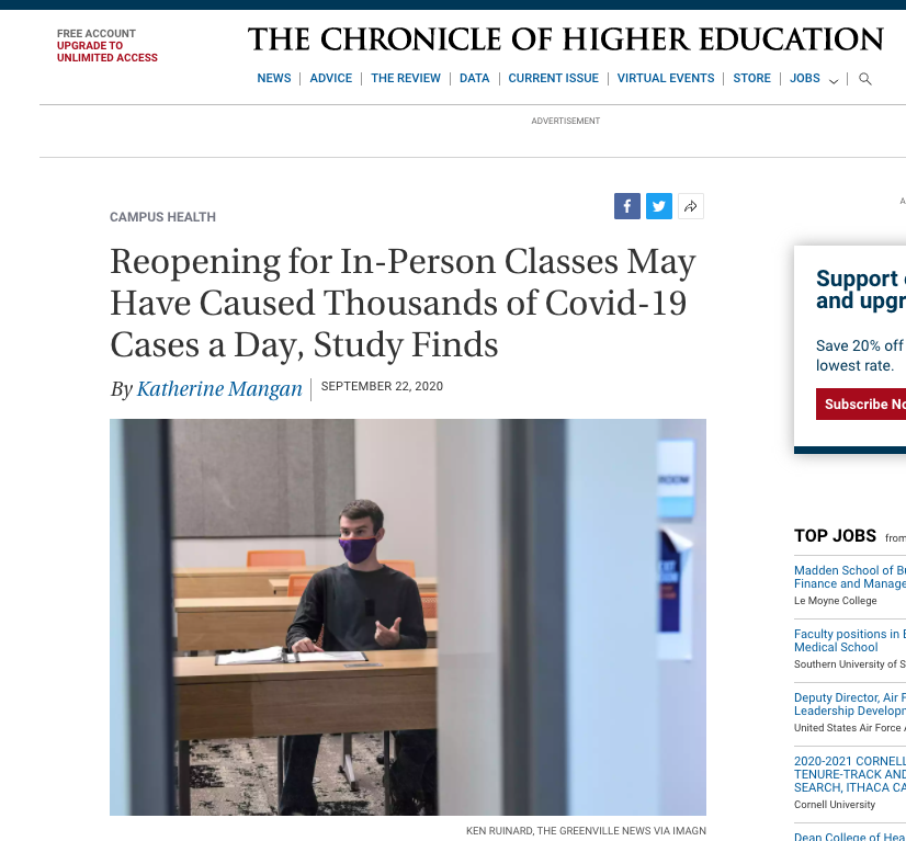 《高等教育紀(jì)事》(The Chronicle of Higher Education)稱,美國流行病學(xué)、健康經(jīng)濟(jì)和高等教育的人員在戴維森學(xué)院(Davidson College)、印第安納大學(xué)布盧明頓分校(Indiana University at Bloomington)、北卡羅來納大學(xué)格林斯堡分校(The University of North Carolina at Greensboro)和華盛頓大學(xué)(The University of Washington)進(jìn)行的一項(xiàng)研究得出,重新開放面對(duì)面教學(xué),可能已導(dǎo)致這些大學(xué)校園里每天新增約3200個(gè)新冠感染病例。