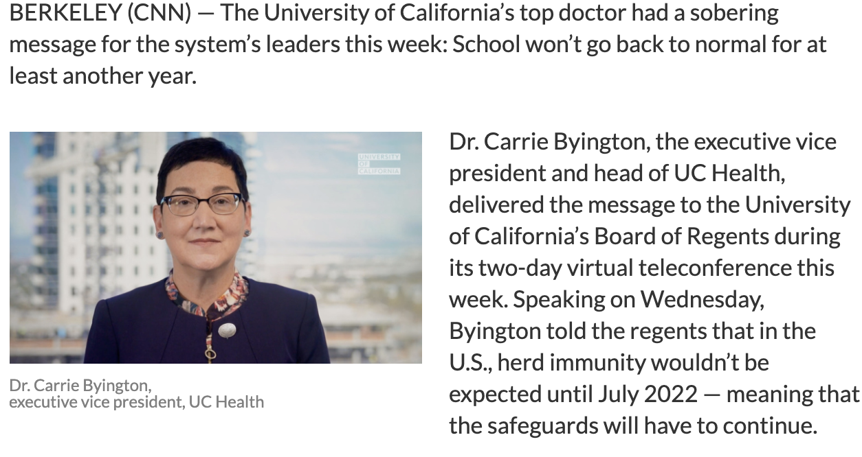 據(jù)美國有線電視新聞網(wǎng)報(bào)道,加州大學(xué)(UC)的資深醫(yī)生凱莉·比靈頓(Dr.Carrie Byington)多次向政府發(fā)出警告并預(yù)測(cè)道,美國學(xué)校至少一年后才能恢復(fù)正常,直到2022年7月才有望實(shí)現(xiàn)群體免疫。