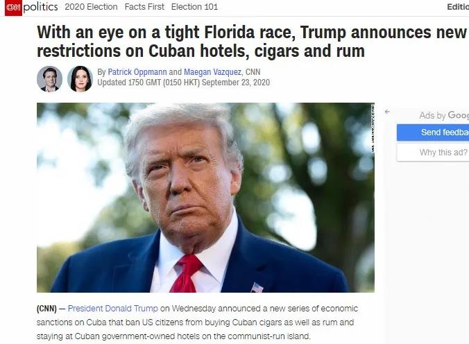△CNN:著眼于佛羅里達州的緊張選情,特朗普宣布針對古巴酒店、煙草和朗姆酒的新禁令。