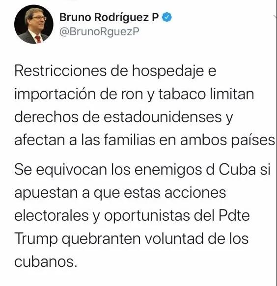 從美聯社的報道中可知,特朗普政府加碼對古巴制裁,顯然也是為了爭取佛羅里達州為數眾多的保守派拉美裔選民的支持。古巴外長布魯諾·羅德里格斯就此回應說,如果美方以為特朗普以選舉為目的做出的投機主義行為會破壞古巴人民的意志,那就大錯特錯了。