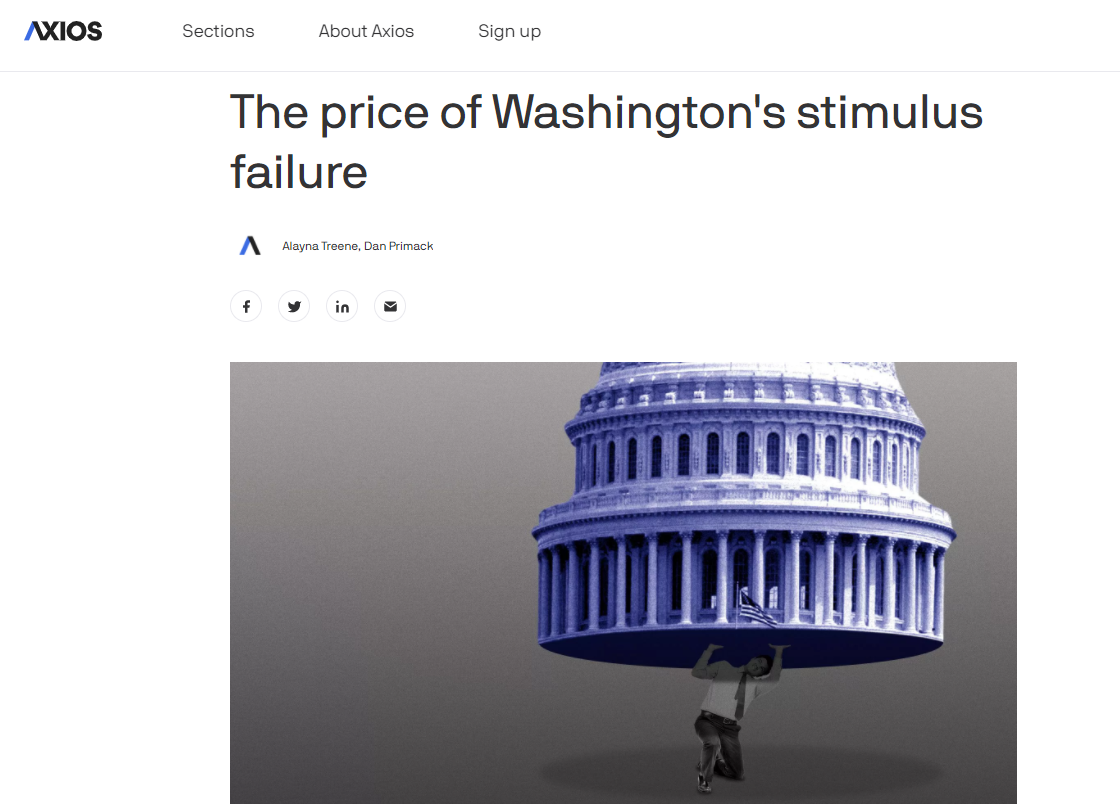22日,美國AXIOS網站發布題為《經濟刺激計劃談判失敗的代價》的文章,詳細盤點了新經濟刺激計劃遲遲無法落地為美國社會、經濟帶來的一系列后果,指責美國聯邦政府的無能。