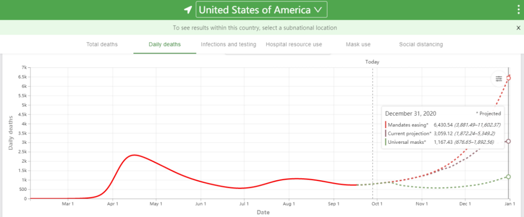 華盛頓大學(xué)衛(wèi)生指標(biāo)與評(píng)估研究所所長(zhǎng)克里斯·莫里也警告,隨著秋冬季節(jié)到來(lái),美國(guó)病例數(shù)可能激增。該研究所預(yù)測(cè),在現(xiàn)行防疫標(biāo)準(zhǔn)下,美國(guó)新冠肺炎日死亡人數(shù)將從目前的約780人驟增到12月下旬的3000人左右。而如果進(jìn)一步放寬管控措施,日死亡人數(shù)將超過6000人。