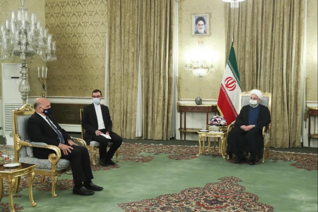 △伊朗總統(tǒng)魯哈尼(右)會(huì)晤伊拉克外長福阿德·侯賽因(左)