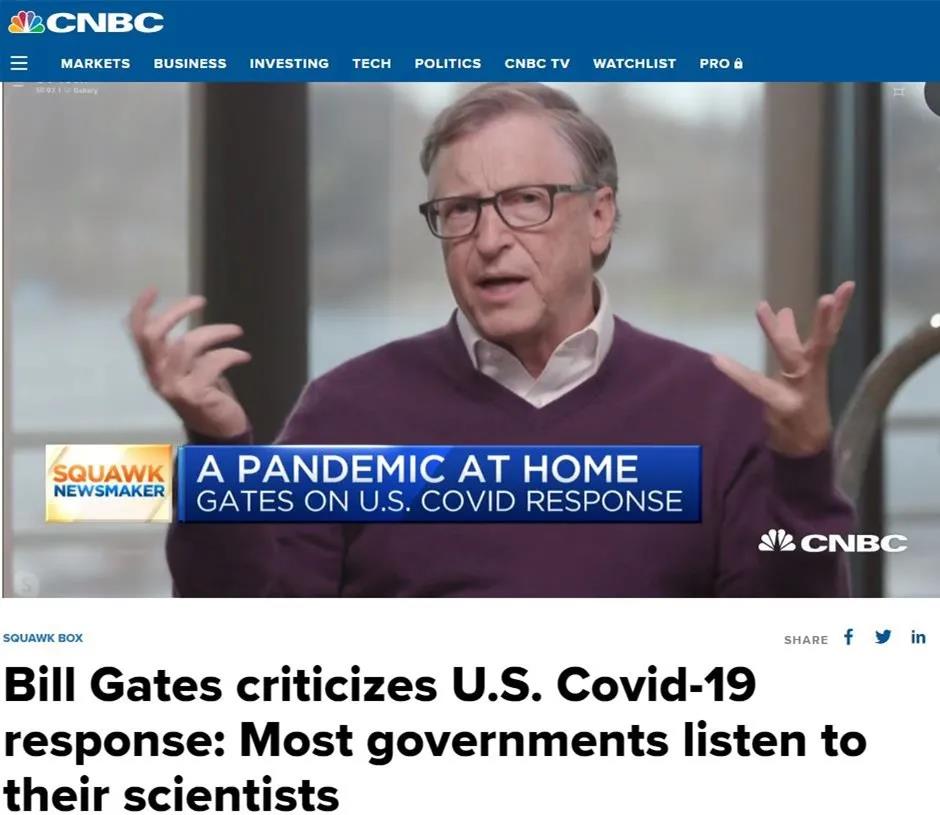△比爾·蓋茨批評美國疫情響應:大多數政府都聆聽科學家的看法(CNBC報道截圖)