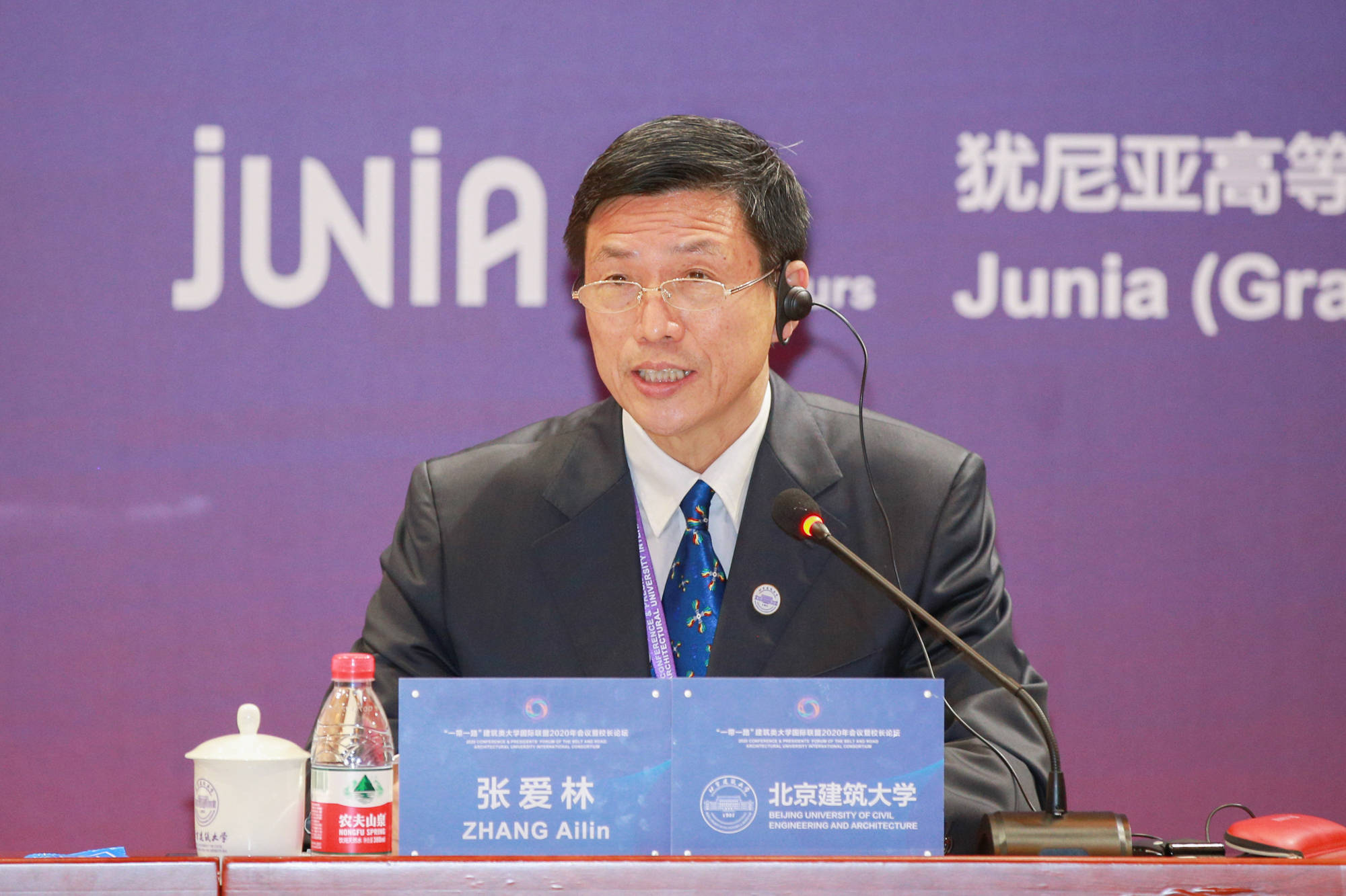 “一帶一路”建筑類大學國際聯(lián)盟主席、北京建筑大學校長張愛林在會上發(fā)言。北京建筑大學提供