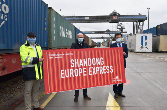 △馬特恩(左)2020年4月30日在漢堡港貨運(yùn)場站與中國駐漢堡總領(lǐng)事杜曉暉、漢堡市經(jīng)濟(jì)部長韋斯特哈格曼共同迎接首趟濟(jì)南至德國漢堡中歐班列的抵達(dá)(來源:漢堡港營銷協(xié)會(huì))