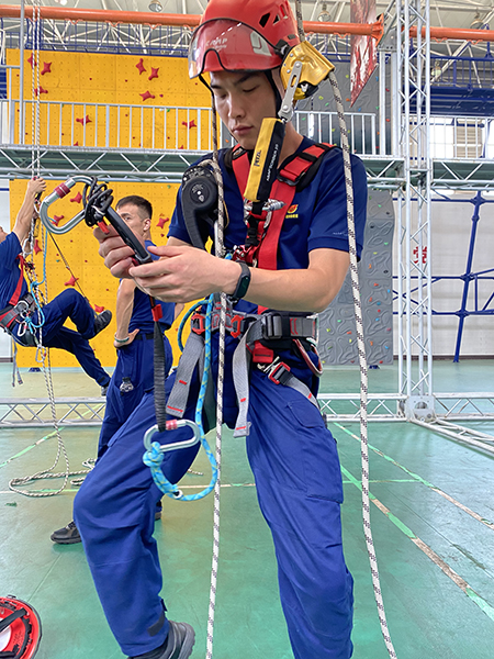 8月14日王鵬(左一)參加繩索救援訓(xùn)練時(shí)的場(chǎng)景