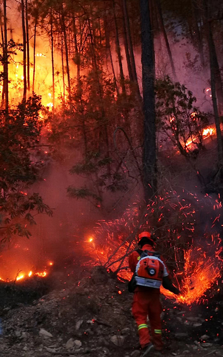 2019年3月,在涼山木里火場(chǎng),王鵬和戰(zhàn)友連續(xù)奮戰(zhàn)10余天,成功將大火撲滅。王鵬身背滅火機(jī)撲打明火。