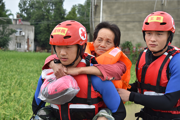 8月17日,四川省成都市金堂縣發(fā)生洪澇災(zāi)害,部分村莊房屋被洪水淹沒(méi)。王鵬(右一)和戰(zhàn)友乘坐橡皮艇挨家挨戶(hù)搜尋轉(zhuǎn)移被困群眾。王鵬和戰(zhàn)友轉(zhuǎn)移行動(dòng)不便的高齡老人。