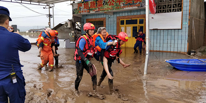 8月19日,王鵬(右一)在四川省樂(lè)山市金粟鎮(zhèn)參加搶險(xiǎn)救援,連續(xù)在水中浸泡了10余個(gè)小時(shí),背著群眾在泥濘中前行,成功將孤島中的群眾轉(zhuǎn)移至安全區(qū)域。
