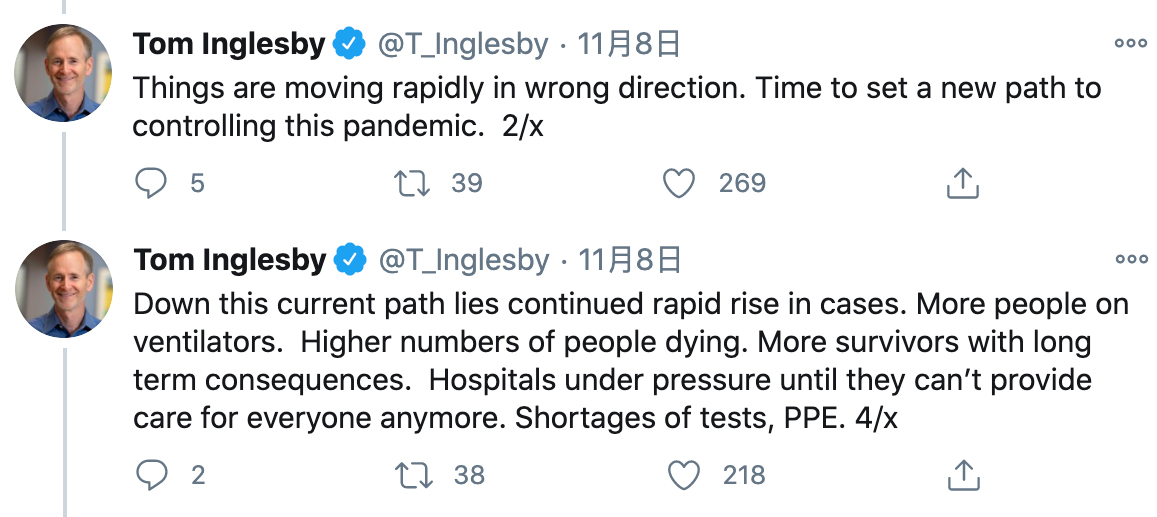 約翰斯·霍普金斯大學(xué)健康衛(wèi)生安全中心主任湯姆·英格斯比在社交媒體上發(fā)文稱:“照目前的趨勢(shì)來看,美國確診病例數(shù)將持續(xù)激增,死亡病例數(shù)也將增加。醫(yī)院將承受越來越大的壓力,直到它們超負(fù)荷運(yùn)轉(zhuǎn),無法再為病人提供治療。”