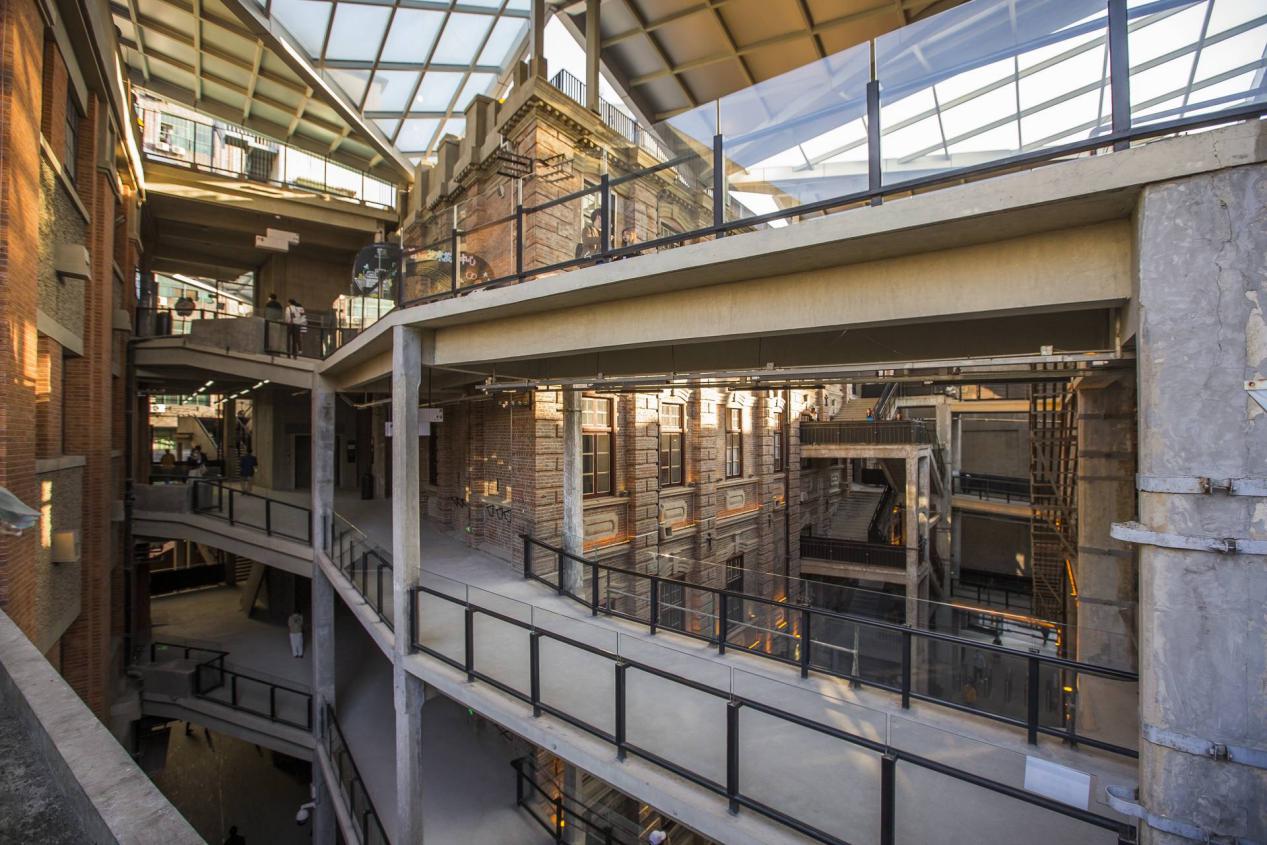 走進園區,記者發現老建筑中的原鋼梁、鋼 架、貨物滑道甚至是水管閥門、 墻上的標語等都完整保留了下來, 系統實施建筑結構加固、墻體修復、配套設施安裝等一系列工程,最大限度保留建筑歷史價值,使其在保留原貌的基礎上煥發出新的光彩。