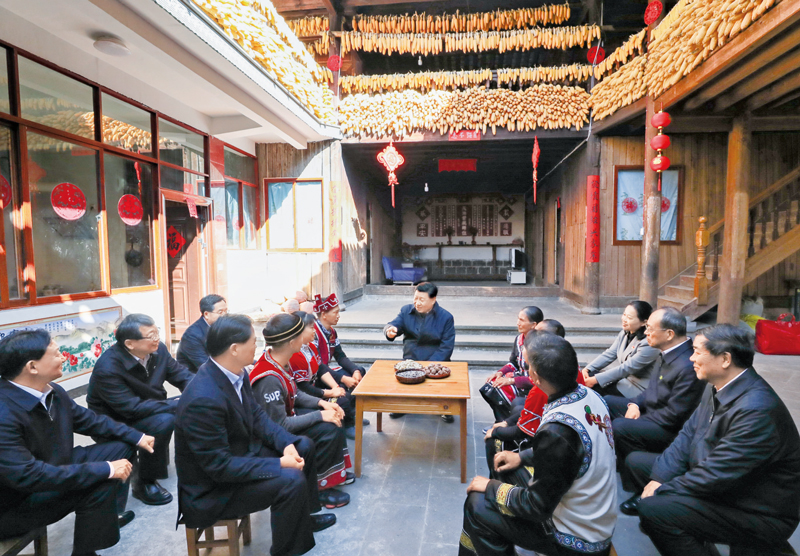 2021年2月3日至5日,中共中央總書記、國家主席、中央軍委主席習近平來到貴州考察調研,看望慰問各族干部群眾,向全國各族人民致以美好的新春祝福。這是3日下午,習近平在畢節市黔西縣新仁苗族鄉化屋村文化廣場上,向全國各族人民、港澳臺同胞和海外僑胞拜年。 新華社記者 謝環馳/攝