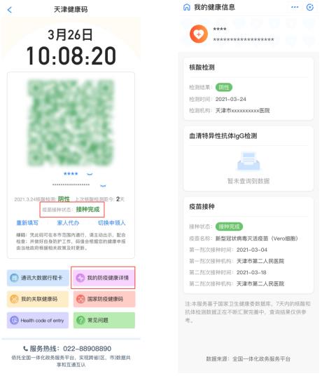 在“津心辦”三端天津“健康碼”亮碼頁面下方,新冠疫苗接種者的疫苗接種狀態就可一目了然。點擊下方的“我的防疫健康詳情”,則可顯示本人7日內的核酸和抗體檢測結果、新冠疫苗接種狀態和詳細的接種劑次、時間和機構等信息。