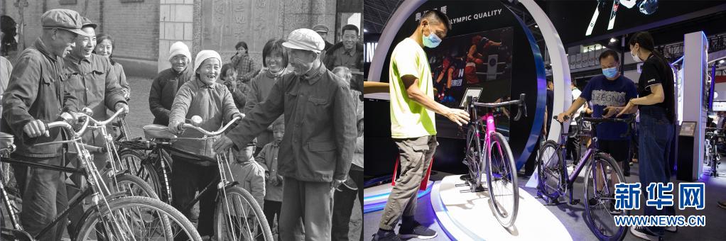 這是一張拼版照片:左圖為1982年,山東省寧津縣杜集公社李鎮大隊社員高高興興地買回新自行車(新華社記者李錦 攝);右圖為2021年5月8日,在海南舉行的首屆中國國際消費品博覽會旅居生活/消費服務展區,觀眾在體驗時尚運動自行車(新華社記者金立旺 攝)。