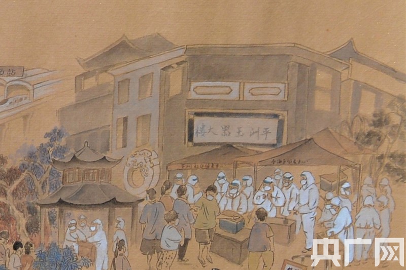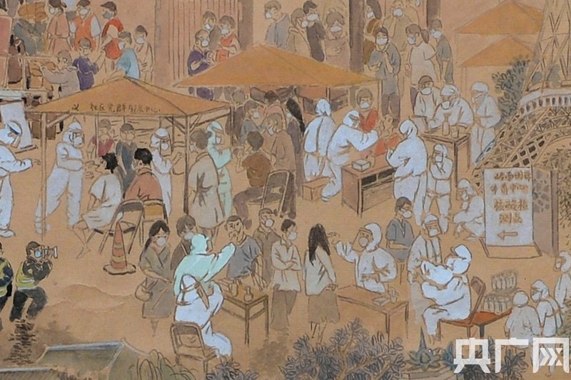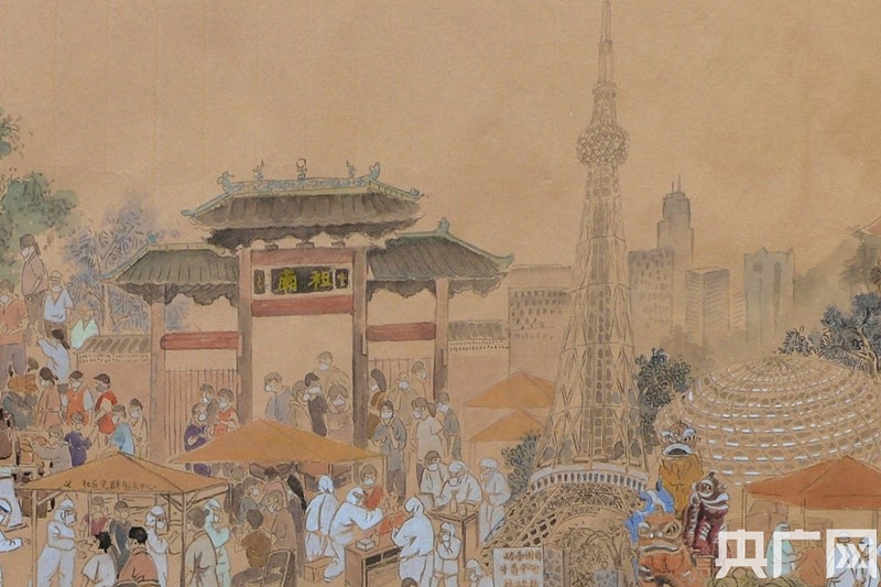 畫卷的整體風(fēng)格延續(xù)了《清明上河圖》的表現(xiàn)手法,大到西樵山、佛山祖廟、嶺南明珠體育館、佛山西站等地標(biāo),小到帶著口罩排隊(duì)的居民、身著防護(hù)服的醫(yī)務(wù)人員、穿起紅色馬甲的志愿者、全副武裝的消毒人員,甚至扛著長槍短炮的新聞記者也躍然紙上。