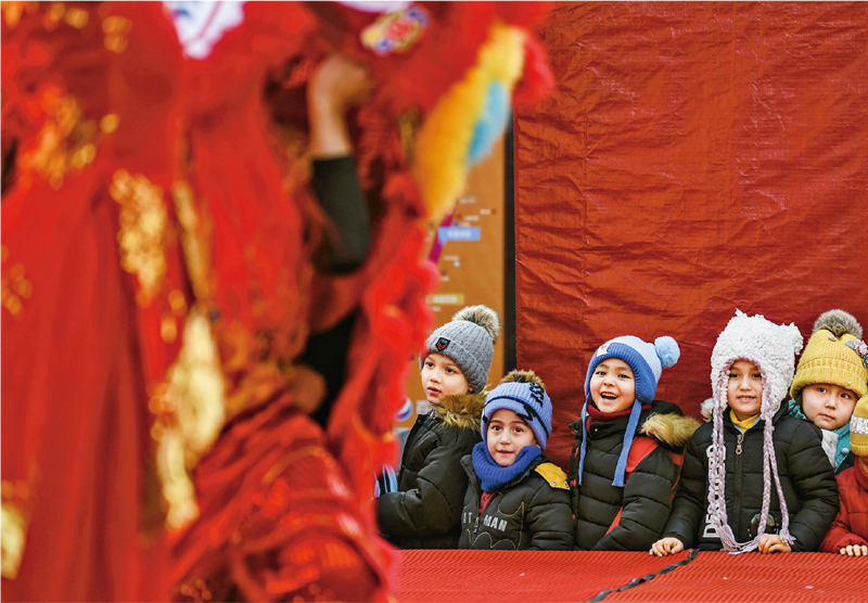 脫貧、全面小康、現代化,一個民族也不能少。圖為小朋友在新疆烏魯木齊大巴扎步行街觀看元宵節舞獅表演。 新華社記者 王菲/攝