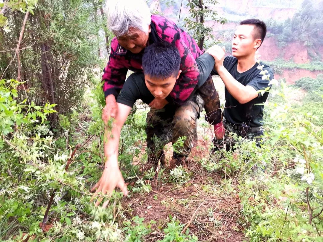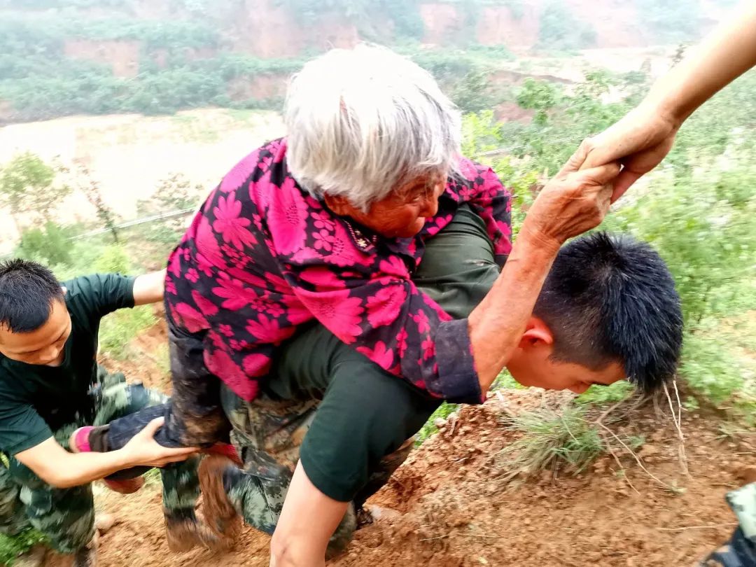 年輕的武警戰士用力地彎下腰來,肩背穩穩地托起白發蒼蒼的老人,手腳并用艱難地在泥濘的山路跋涉。