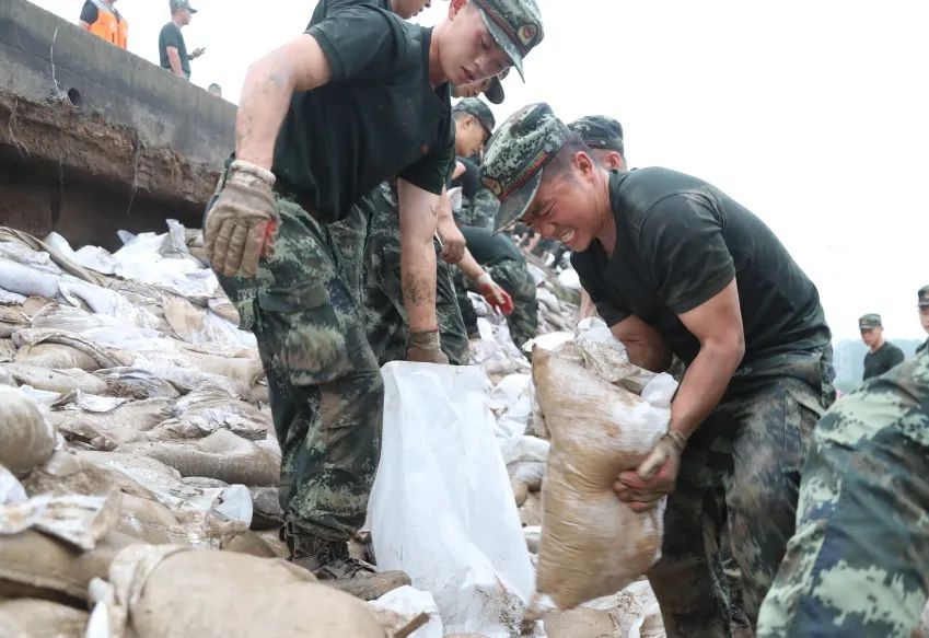 這是一張“00后”士兵的臉,大堤上,他咬緊牙關,眉頭緊鎖,低下身子,吃力地舉起沙包往肩上送。那張黝黑的臉憋得通紅,汗水順著脖子往下淌,軍裝早已濕透。